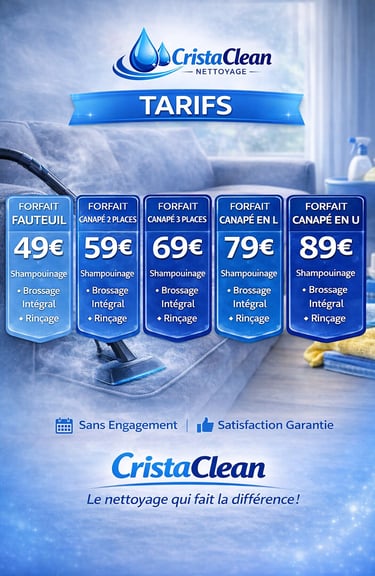 CrystaClean est un service professionnel de nettoyage de textiles à domicile. Nous vous proposons un nettoyage complet de vos canapés, matelas, de votre moquette ou de vos tapis. Taches, urine d' animaux, poils, tout peut être traité. Nous faisons rajeunir vos textiles de plusieurs années ! Les prestations se composent de l' injection d' un produit qui détache en douceur et profondeur.. Ensuite, le textile est entièrement brossé avec un second produit qui nettoie la surface. Le tout est ensuite extrait. Puis vient le rincage, avec un produit professionnel qui redonnera de la douceur aux fibres pour un toucher et un aspect impeccables. Par soucis de facilité, nous veillons à ce que le textile soit a peine humide après notre départ pour que le temps de séchage soit très court. Le tout peut être complété par un traitement anti-odeurs qui les détruit à la source. C' est un produit professionnel spécialement destiné a supprimer les odeurs d' animaux dans les textiles. Nous n' utilisons que des produits et appareils professionnels, ce qui garantit un très bon résultat. De plus, nous sommes très soigneux et prenons le temps qu' il faut pour que le résultat soit impeccable. Notre secteur d' intervention est Metz et jusqu' a 30 Km autour. N' hésitez pas à nous contacter pour renseignements ou prise de rendez-vous. Auto-entrepreneur. Toutes mes prestations sont déclarées à l URSAFF