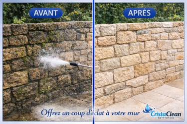 Lorsqu’il est mal utilisé, un nettoyeur haute pression peut détériorer les joints ou fragiliser certains matériaux.C’est pourquoi CristaClean adapte la pression et la technique selon le support : nettoyage mur extérieur, nettoyage allée pavée, nettoyage terrasse en pierre ou béton. Un nettoyage extérieur professionnel garantit efficacité et protection des surfaces..